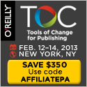 Last day today, February 14 New York City (again at Marriot Marquis Times Square) O’Reilly Media’s Tools of Change for Publishing Conference: “Every February, the publishing industry gathers at the O’Reilly Tools of Change for Publishing Conference (TOC) to explore the forces that are transforming publishing and focus on solutions to the most critical issues facing the publishing world. TOC sells out every year—don’t miss its potent mix of fabulous people and invaluable information.” Under the direction of Joe Wikert and Kat Meyer.