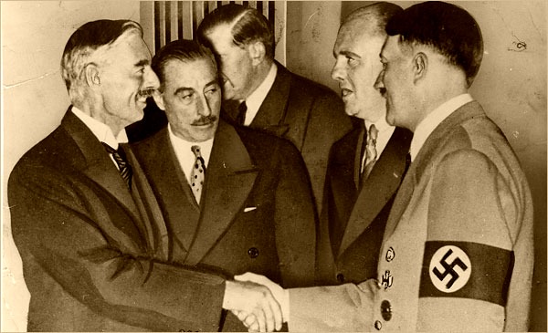 Appeasement: U.K. Prime Minister Neville Chamberlain and Hitler, 1938.On the other end, the hands-off position taken in the second quote misses the point just as badly. Religion has too often been used as an excuse to perpetrate atrocities. The terrorist jihads of Islam, along with the crusades and witch hunts of Christianity, are based on dogmatic beliefs and interpretations that must be condemned in the strongest possible terms, not excused on the basis of religion. We tried the whole "live and let live" approach with Nazi Germany during World War II. It was called appeasement, and it didn't work.