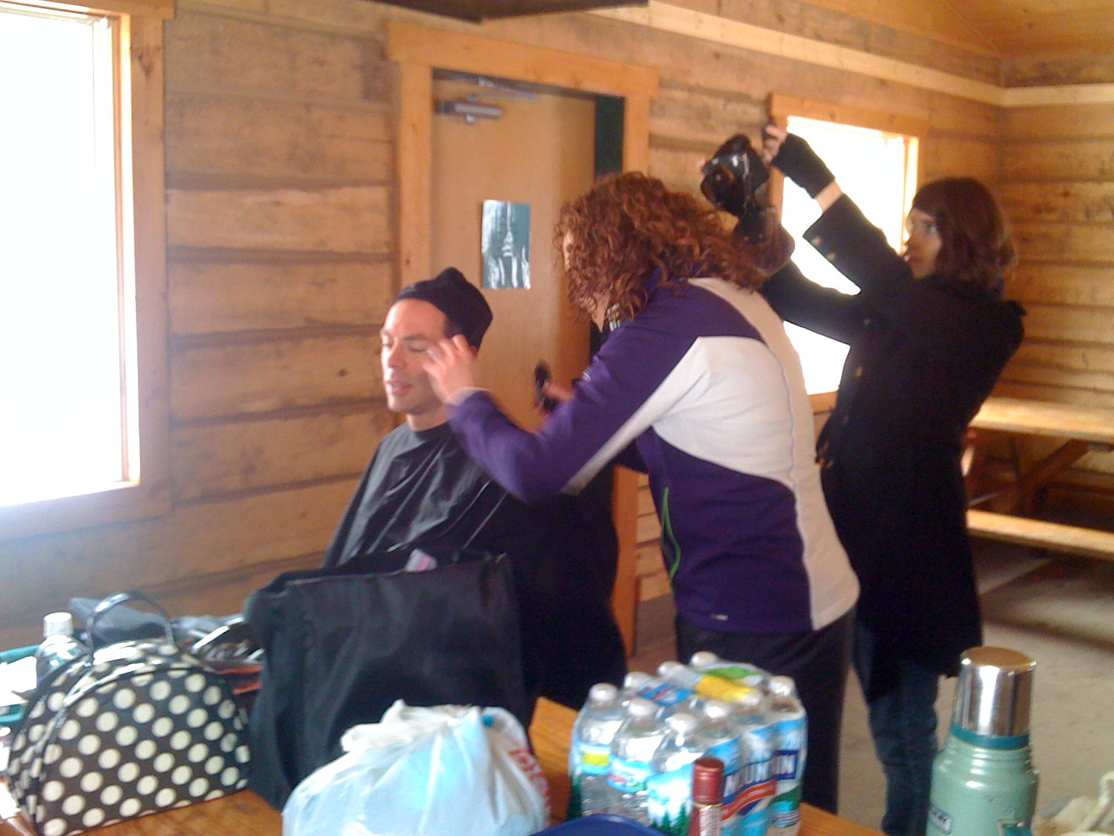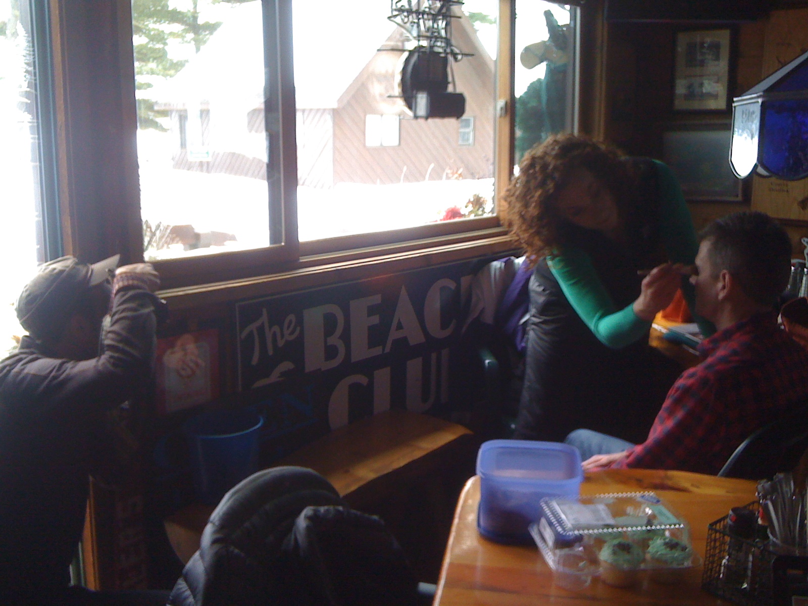 Jennifer, getting Mr. February ready for his shoot while Meg lines up her shot.