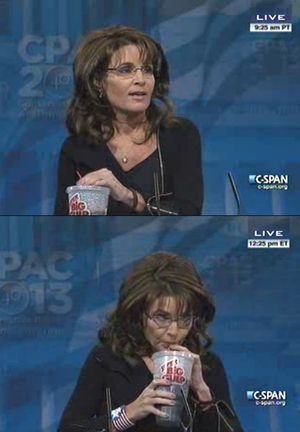 Palin Denounces Cheap Campaign Tricks, Drinks Big Gulp