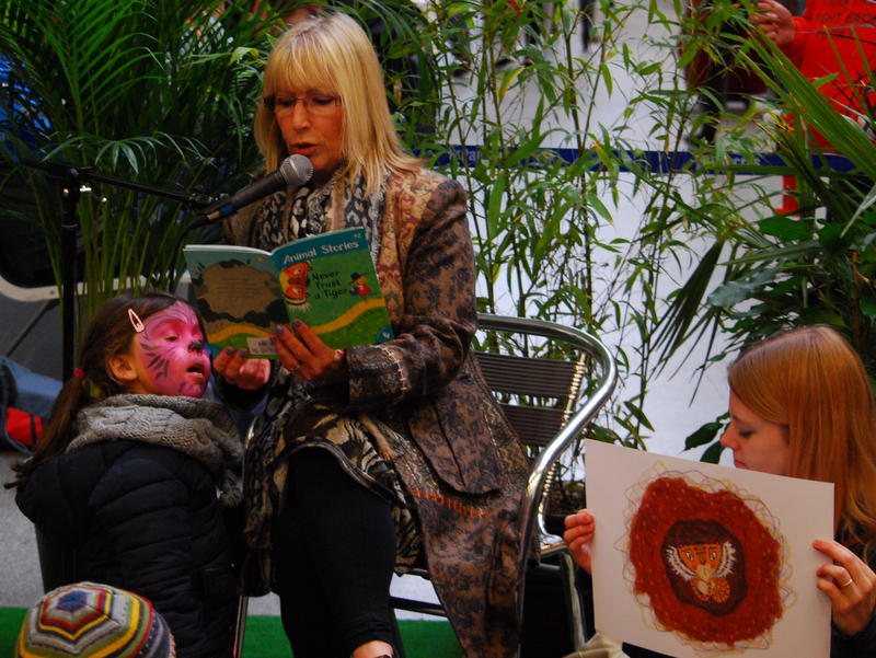 A very interested pink tiger takes a peek!The children who listened to the stories were great, as it must have been very difficult to concentrate with so much noise and distraction all around, including the never-ending station announcements about unattended luggage etc! The little girl in the picture above was very keen to see my copy of the book (Never Trust a Tiger by Lari Don) despite Lisa helpfully holding up larger pictures, and she kept knocking my microphone away in her efforts to climb up onto my lap!