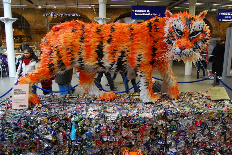 Tiger made from recycled plastic milk bottlesI had originally offered to read from my battered childhood 1960s copy of Mowgli's Stories, the source of the very popular Disney film, The Jungle Book. I have fond memories of my father reading this beautiful book to me, and of the huge colour plates that brought the magical Rudyard Kipling prose alive. But on closer inspection, fifty years later, I realised this was not suitable to read aloud to small children in public - not least because Shere Khan was an evil tiger who was killed by Mowgli, and skinned! Hardly the message that the Save the Wild Tiger campaigners wished to get across.