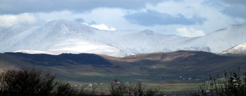 Snow lies thick on Mount Brandon, but the hills and valleys below are green with new grass.