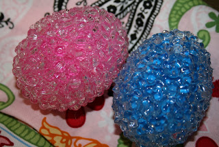 Look closely and you'll see tiny beads embedded on these plastic eggs with a glue gun. This gives me an idea. I'll be glue gunning eggs later this week!