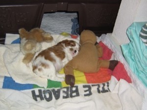 I turned the whelping box upside down yesterday! Now it is a den. The baby does spend a lot of time tucked away in her nice warm dark den, but as you see, she also comes out to see the wider world — and collapses into a restorative sleep after toddling around for about ten minutes. She is making definite play gestures toward her mom and her toys. Next week she will be hitting the UltraCute stage and starting to play with the other dogs. My Adora, who has had puppies of her own, can be trusted to play gently with a puppy — the teenagers will take more supervision!