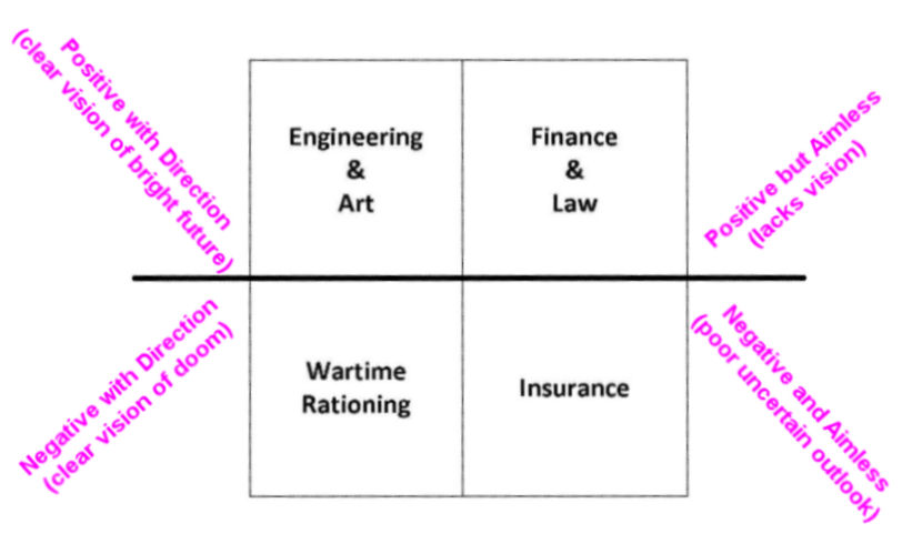 (concept courtesy of Peter Thiel and SXSW) I have been saying for a long time that these new tech entrepreneurs have a different worldview than the rest of us, and this is largely it. Let's talk about the text in the pink. For the longest time, the US and populations of other developed countries saw the world through a prism of everything getting better. Each generation felt the future was bright and getting brighter. They had optimism and a clear vision of good things to come. That can be found on the above chart in the upper left: "Positive with Direction." To US citizens, that was the way our world looked for most if not all of the 1900s and even into the early-2000s. People in this mode had a clear and positive view of the future and worked steadily toward it. But then something happened. Our world economy began to sink, and today most US citizens have moved into the mindset in the upper right: "Positive but Aimless." We are still optimistic (largely because it's a habit, I suspect) but we aren't really sure why. Bear with me, I promise the theory will be over in a just a few more words. Then we'll talk about changing our lives, right now! According to Peter, most of the rest of the developed world, China, India, Europe, etc... feel much less positive about the future. They believe things will probably get worse, even if they're not exactly sure how. These people fall into the lower right hand category: "Negative and Aimless." Now the worst category of thinkers would be in be the lower left: "Negative with Direction." These people are not only pessimistic about the future, they are also certain that it's going straight to doom and gloom. They have a vision...but it's for disaster. The terms within the quadrants describe which types of companies/systems generally thrive in each of the four environments. Of course, we all understand that "Wartime Rationing" means that almost no company is doing well. The "Insurance" section also makes sense. People that believe the future is bleak and uncertain will likely invest in insurance to cover those losses. In that quadrant, insurance companies will be the big financial winners. Peter Thiel believes this is why Warren Buffet's largely insurance-centric companies have done so well, because so many countries currently have a bleak outlook on the future. The upper-right quadrant is for companies that are optimistic but lack vision. They tend to spread their product development out among many lines (think Sony) and assume that some percentage of their goods will sell well. In truth, those successes are not at all certain, and the companies earning most in this environment are the legal and financial firms in the background. Finally (yes, we're near the end of the background stuff), companies that are "positive with direction" have a clear vision for the future and develop specific plans to get there. Pixar's and Apple's high-quality successes come to mind. The exciting thing is that anyone with clear vision and direction can not only survive but thrive in any of the four environments. That means that simply by changing our mindset we can enjoy the same bright and definite futures as those positive tech companies.