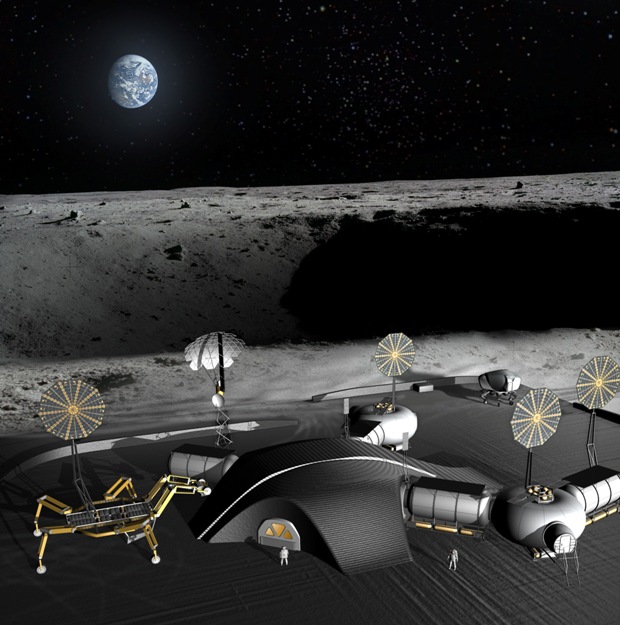 In a moment, we'll talk about the specifics of not one but two types of automated moon-building robots that would take as little as a week to build a full-sized human shelter out of moon dust, but in the meantime let's talk about how this effort could fit into a much larger, much grander plan.