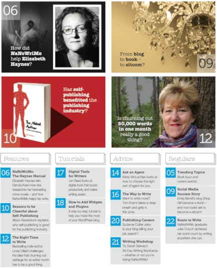 We have two bestselling authors who used NaNoWriMo: Elizabeth Haynes and Julia Crouch; plus bestselling indie author Linda Gillard, who challenges the idea that churning out verbiage for an entire month has to be a good thing. Writing coaches Tom Evans and Sarah Salway are here to boost your productivity, Jon Reed looks at some digital tools to help you write, Suzanne Collier offers careers advice, and Kirsty McLachlan helps you decide which sort of agent is right for you.