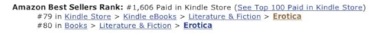 Today I checked the book’s Amazon page for new reviews and noticed not only had the book’s overall Amazon ranking gone up, the book has climbed its way onto the Kindle Erotica bestsellers list! It was at #79 of the top 100 when I looked. If you’re curious, this is what that looks like: (you can’t hear me squeeeing very loudly, you can just look…)