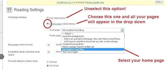 I’ve written before about making your page titles relevant to your content, trying to avoid ‘Home’ and ‘About’ etc. This example, which will eventually be a foody site written by my other half with annoying argumentativeness from yours truly, has a home page called Not Another Food Blog. Since this is where I want people to arrive when they first come to the website, I’ll select it where the settings say ‘Front page displays’.