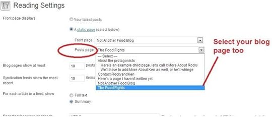 Then we will define a blog page too. WordPress wants to know that you have a place to put posts, even if you never make any, so we just do this because we do it. In the example I’m using there will be a blog page, I’ve called it The Food Fights, but if you don’t want a blog on your website just make a blank page called ‘Blog’ and select it here. Remember to save your changes.