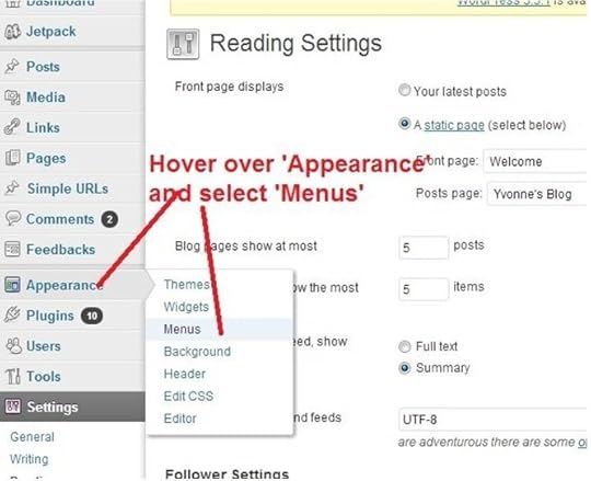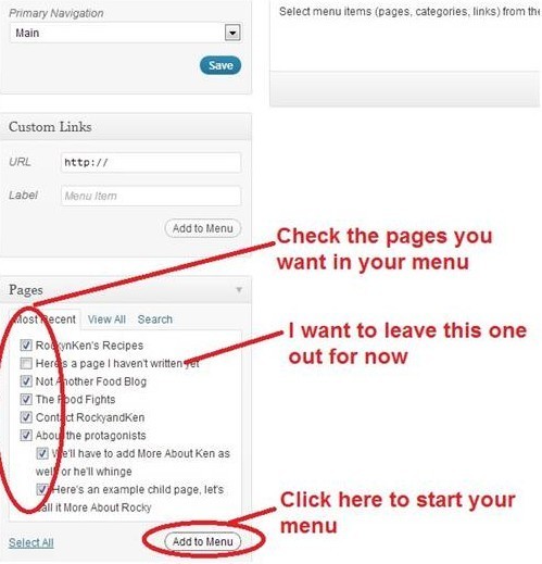 Now we’re going to tell the navigation bar which pages to display. You do this from yet another bit of the left sidebar in your dashboard.