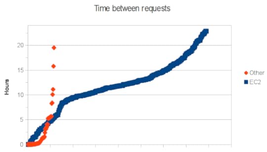For EC2 instances, the median time between requests is 11 hours and 45 minutes. So EC2 instances are being automatically redeployed twice a day. For non-EC2 instances, the median time between requests is 51 minutes, and the modal time is about zero. Those people set up a dev environment, discover that something doesn't work, and try it again from scratch.