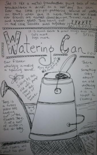 I am noticing that drawing a picture each day focuses my attention in one place, something I strive to do more regularly. Today I most like the note, "It is a teapot for flowers." Yesterday I drew a useful object, and I think I'll be doing this again.