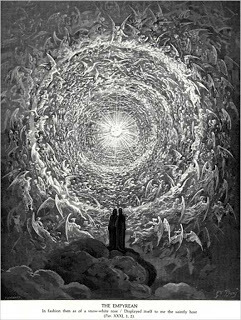 Merkabah Rider – An ancient Jewish mystic who fasted and prayed to reach an ecstatic trance. While in this trance state, he sent his soul upward through the heavenly halls in an attempt to reach the Throne of Glory that is supported by the chariot of Merkavah (the fiery vehicle seen by Elijah). The objective of the Merkabah Rider was to join himself with the Universal Soul. During this journey, the Rider was constantly plagued by demons. The Merkabah Rider used prayer, magical talismans, incantations, and asceticism to enlist the aid of angels, who would protect him throughout his journey and ultimately defeat his antagonists. I also found an illustration by Gustave Dore for John Milton’s Paradise Lost, The Empyrean, which depicted the Heavenly Host turning as a great wheel or flock around the brilliant presence of God in the middle. It’s at once beautiful and harrowing.