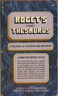 Another must-have book for any writer is a thesaurus, and I have two. My most used edition is Pocket Book's Roget's Pocket Thesaurus, which has been helping me to find the right word since the late 60s (and looks it). When I need a thesaurus with a wider range of selections I turn to Roget's International Thesaurus published by Crowell in 1962. Both of these books use the system developed by Dr Peter Mark Roget for his first thesaurus in 1852, that is words arranged by classification, then by divisions and sections, each step narrowing down groups of related words. I've tried using thesauri arranged alphabetically, but they just don't work for me. A thesaurus can be a very dangerous book in the wrong hands, as I found out when I was a newspaper editor in the 70s and encountered a young journalist who had been told in school not to use the word "said." Interviewees would shout, harangue, stump, blurt, exclaim, call, yell, whisper, murmur, repeat, state, aver...anything but "said." I could not get her to understand that words have shades of meaning, that words were generally not interchangeable, and everything depended upon context and connotation...so I locked her thesaurus in my desk drawer.
