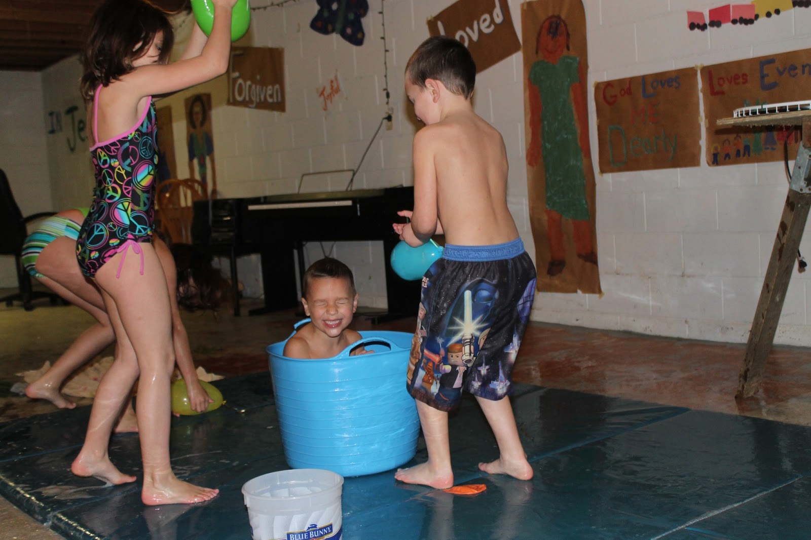 Finally, WATER PLAY.We had water, and they had bathing suits. So what if it was snowing out. It was spring break after all! So we'd pretend it was summer in our basement.
