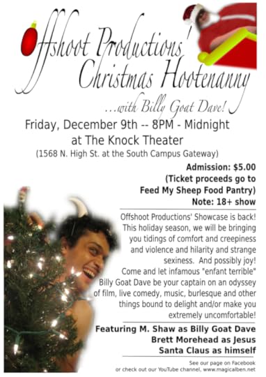 Planning the showcase has been on my time like a lion on a zebra carcass. For one thing, I’m writing all of the live portions (that kind of thing being my, you know, job with Offshoot) and I’m emcee-ing 80% of the sucker to boot. Draining as hell and totally worth it because the show is kick god’s balls. It’s a Christmas special written by somebody who hates Christmas. Jesus shoots Santa in the leg and then emcees the burlesque show (the 20% I’m offstage for). The best part involves a potato but I can’t really explain that here.