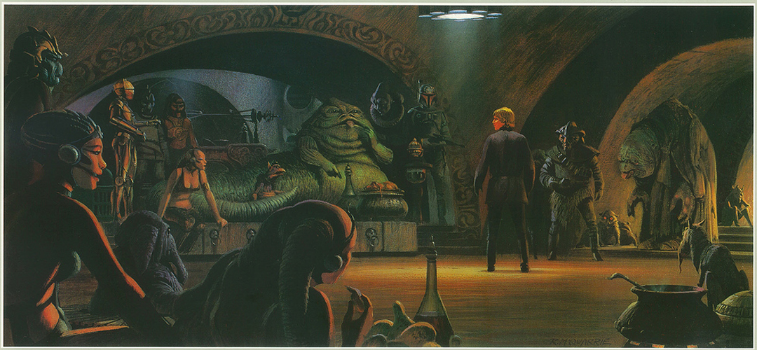 Many of these paintings were gathered together and sold as reproductions in a portfolio released in conjunction with the movie. Below are various views, environments and scenes within and without Jabba's Palace, including the battle over the Great Pit of Carkoon.