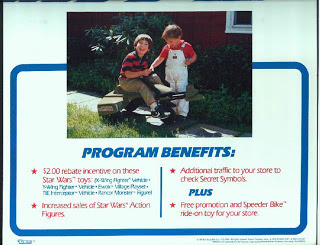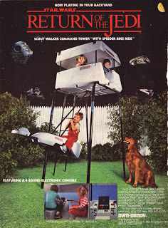 If you didn't win one of the bikes, you still had a shot of having one of your very own to ride back and forth in your back yard. This speeder bike was a speeder bike shaped swing that had the benefit of actually being up off the ground where it seemed to float through the air if you were an imaginative kid. You'd have to be a superbly imaginative kid to envision the mounted tower playhouse above the swing as the AT-ST scout walker it's meant to be. Maybe it's easier to do sitting on the inside of it. In any case this is still pretty cool.