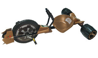 There is a modern ride on pedal bike manufactured by an Australian toy company called ToyMonster. I'm not sure what Star Wars movie they were working from, but adding a couple of tiny flaps next to the front wheel, an Imperial style logo to the wheel and the Star Wars logo to the seat does not make this thinly disguised Big Wheel/Green Machine a speeder bike. It's probably safer, and faster than the Huffy version, but it's nowhere near as cool.