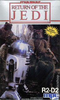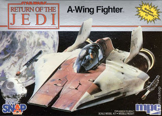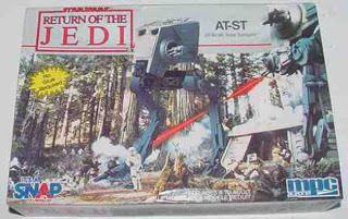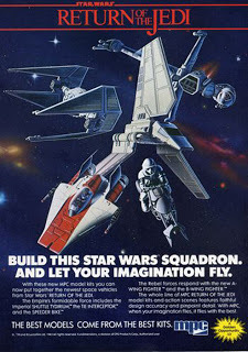 Among the various products spawned by Return of the Jedi, was a line of model kits produced by MPC. MPC had been producing popular Star Wars model kits since the first movie, and reissued a number of them with new ROTJ tie-in art on the boxes. The models came in basic snap-together forms which required no glue, and the traditional, and slightly more complicated, glue together variety.