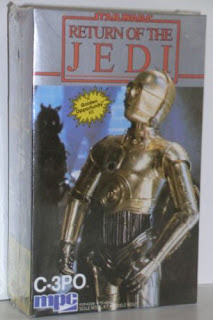 Except for the X-Wing Fighter, I owned all of these kits. C-3PO, I recall being the one that was most difficult to build because there were rubber bands to be manipulated, so that the limbs could move, that had to be held in place while gluing his torso together, and I felt like I needed extra arms to pull this off.