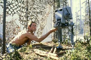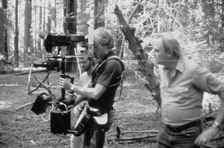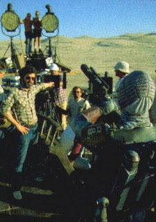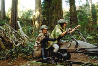 Special Effects supervisor, Dennis Muren watches steadicam operator (and inventor) Garret Brown filming the background footage for the speeder bike chase sequence.