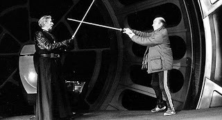 Bob Anderson, in the Darth Vader costume rehearses a light saber battle in the Emperor's throne room.