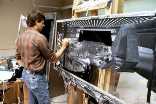 George Lucas and Howard Kazanjian examine miniature T.I.E. fighters and T.I.E. interceptors.