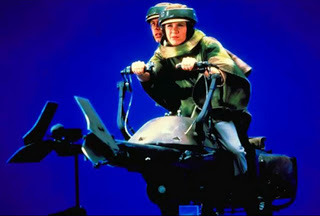 Mark Hamill and Carrie Fisher on a speeder bike.