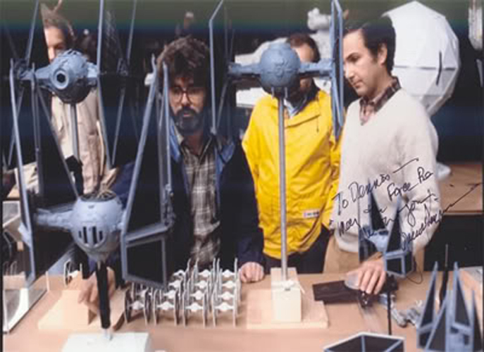 George Lucas and Howard Kazanjian examine miniature T.I.E. fighters and T.I.E. interceptors.