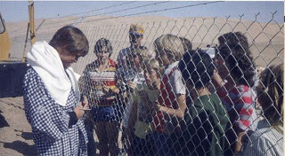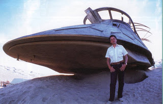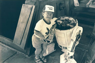 Kenny Baker on location in Yuma, AZ, with one of the remote control R2-D2s.