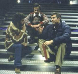 George Lucas, Howard Kazanjian, and Richard Marquand in the Emperor's Throne Room.