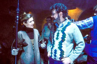 Carrie Fisher and George Lucas in Jabba's throne room.