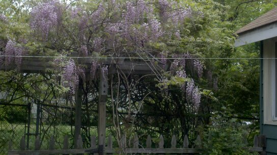 Anyway...I did take pics of the gardens the other day, so I'll have to use those. Here's our arbor covered with wisteria before the last day and a half of rain...it's really lush now! It is also the resting place for bears--apparently the lure isn't the wisteria itself, but the birdseed and suet we hang from the arbor for the birds. Not a fan of black bears hanging out on the arbor, but hey we do live in the wilds of northern NJ. LOL!