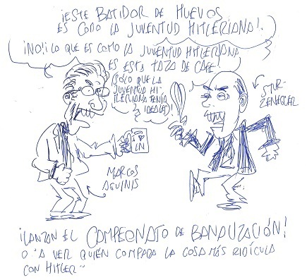Obsérvese la delicadeza que he tenido en incluir cartelitos explicativos aclarando quién es quién, y no porque no los sepa dibujar (de hecho me quedaron BÁRBAROS) sino porque el grueso de la gente, la masa, el pueblo no tiene puta idea de cómo son Aguinis -tomado como símbolo de La Nación, su exabr...