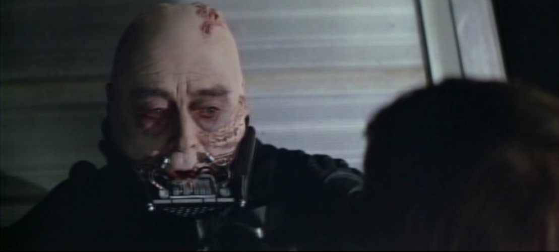 Then the moment finally arrives when Darth Vader asks Luke to remove his mask, and the whole audience stopped breathing in anticipation. My guess is that this was not what they were expecting to see. I sure wasn't. Except for a couple of, admittedly serious looking, scars and a lack of exposure to sunlight, he was just an old man. I get that this was Darth Vader finally re-obtaining his diminished humanity and that that would probably be undermined if his face was a mass of melted flesh, but my young self was a bit let down.
