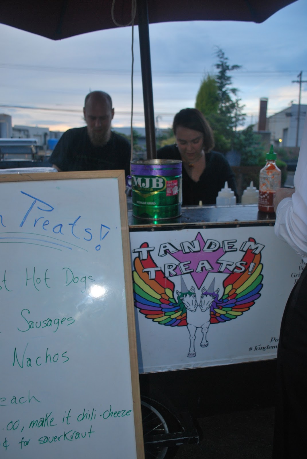 Outside the gala, a couple of food carts were selling dinner. There was a taco cart and a hot dog cart. Joel and I both chose the Tandem Treats hot dog cart because their logo was a two-headed rainbow unicorn.