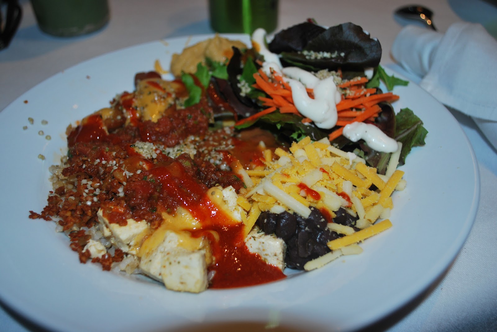 Lunch was a Build-a-Bowl buffet! There were all sorts of goodies for bowl piling, and I think I managed to fit every one of them in this bowl — brown rice, quinoa, tempeh bacon, Upton's seitan, tofu, black beans, pinto beans, raw walnut meat, Galaxy vegan cheese, hummus, Nacheez, hemp seeds, lettuce, carrots, and garlic sauce. Oh, and Secret Aardvark habanero sauce and sriracha!