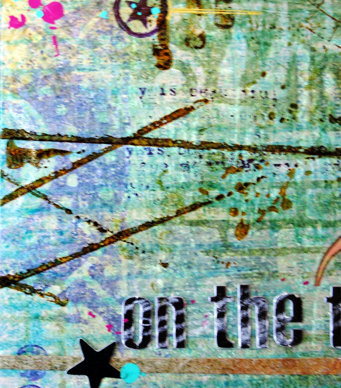 To this basic background I stamped using my newly created foam stamps, creating some additional, subtle background design. I then added many mixed media elements, including paper, alphabet letters, stickers, ink, rub-ons, marker, wax pastels, pen, pencil, and more.