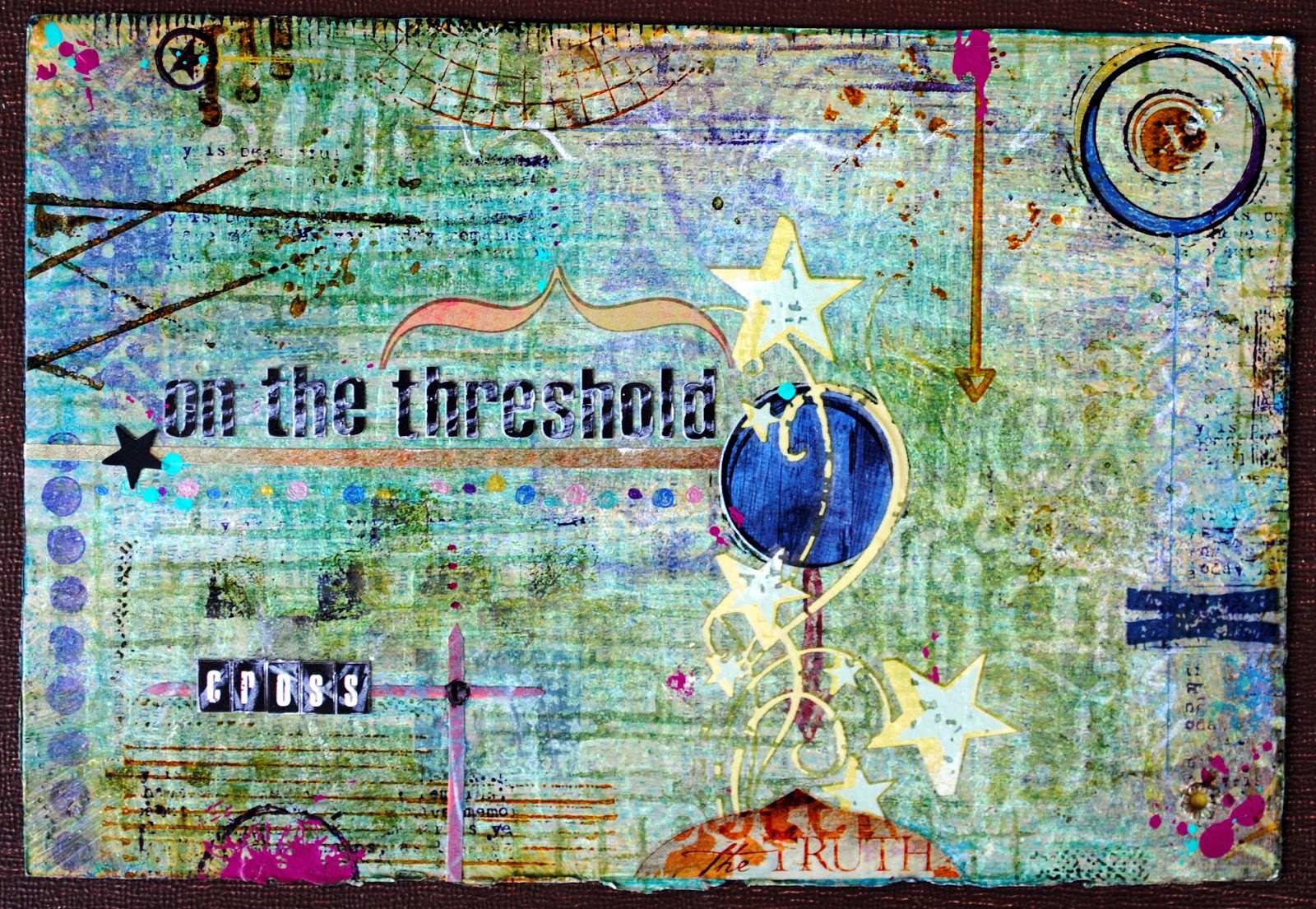 One of my favorite "art exercises" is to think of non-traditional ways to use art supplies and products. To me, that is part of what being a mixed media artist is all about. So in this piece, On The Threshold, I decided to use Spellbinders M-Bossibilities folders in a new way.