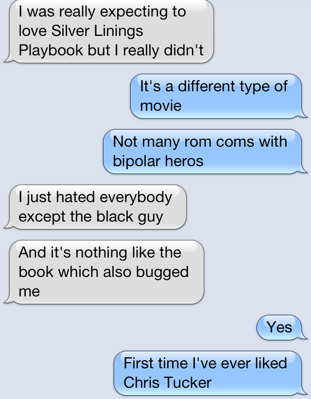 . Then I realized it was a text conversation I had a few days ago with my friend Sare (who has shut down her blog). Since we live on different coasts (and she in Canada) we almost exclusively communicate by texting (iMessaging, to be exact, other wise each text would cost me $0.50) with the occasional email thrown in. But there I go being ADD again.
