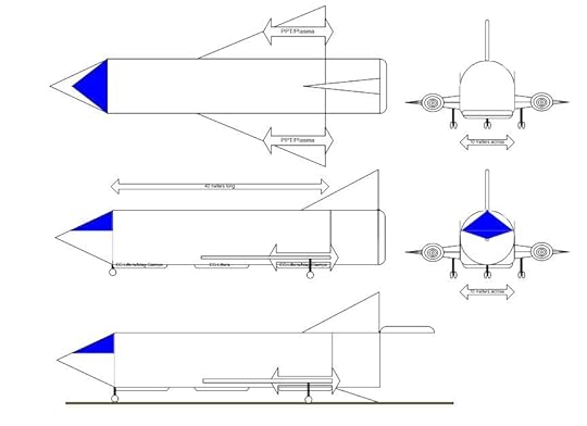 It is about 150 feet in length with a wingspan of maybe 70 feet. It is powered by oversized plasma thrusters and PPT drive generators. The stock version has a huge cargo bay. The cockpit is designed with its own airlock so that the entire cargo section can be exposed to space. There is a side airlock for space excursions where you don't want to evacuate the cargo section.