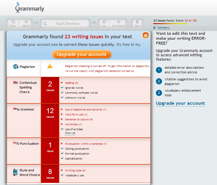 23 writing issues and a score of 62 out of 100. D-minus. Appalling. It seems I must write more good.