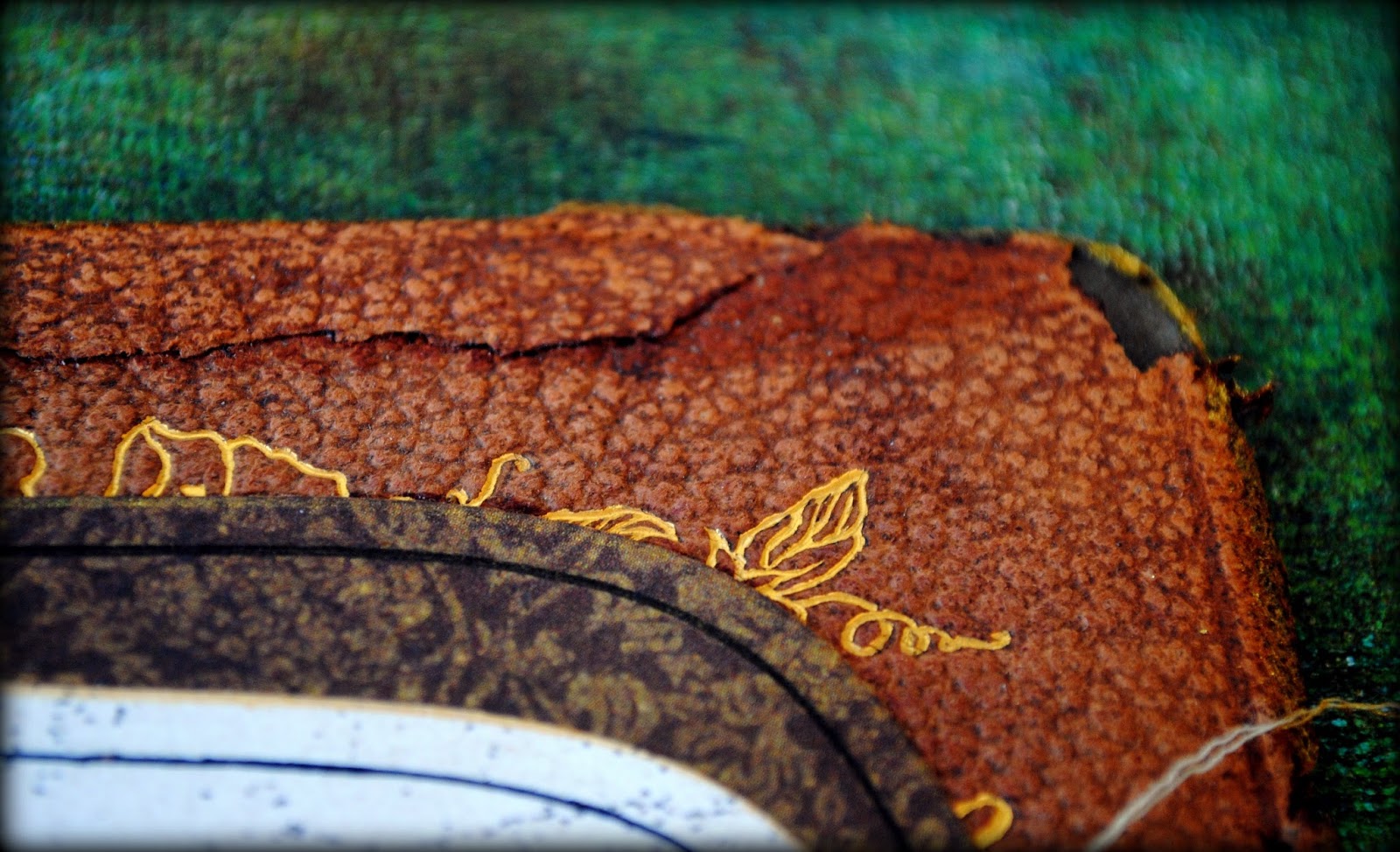 Believe was inspired by a vintage book cover that has been in my collection for some time now. I loved the textured book cloth, the naturally brittle and distressed edges, and the beautiful gold embossing. The dark patch of color does not read as bold in real life.