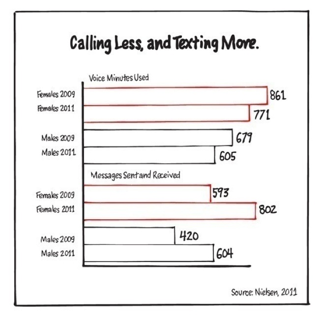 Usage data proves this point. From 2009 to 2011 American females’ use of voice minutes on mobile phones decreased by 12%. During the same period their text messages sent and received increased by 35%. For men, it increased 44%.