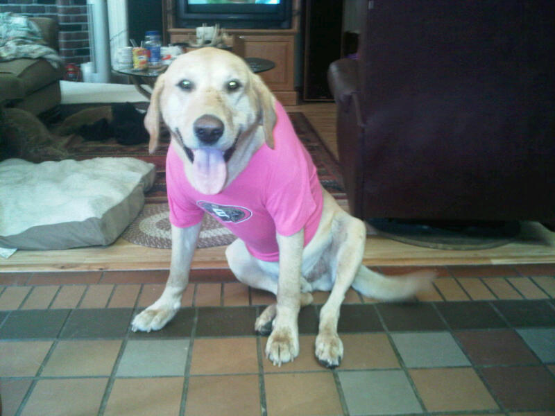 In the meantime, here is Bear, wearing his pink T-shirt. He has stitches in his leg, which will come out later this week—thank goodness. In order to keep him from licking at them, I’ve been making him wear shirts—and changing them up to three times a day. Labs love water and can find it when no one else can! He does have one of those silly ‘cones’, but it truly is pitiful. Bear is over 100 pounds, so the cone is larger than a lampshade. He can’t go through doorways with it on, and the first day, he tried to follow Cody up the stairs, but the cone kept hitting the steps above him. In the end, Bear turned around and backed all the up the flight of stairs, including where it turns the corner. That couldn’t have been good on the stitches, so I dug out old T-shirts.