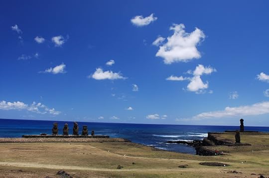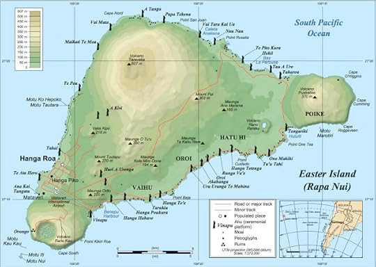 I found this map of Easter Island on Wikipedia. It is amazingly detailed with all of the locations outlined. Hanga Roa is where most ships and boats dock. Ahu Tahai is close to it. There are five moai on that particular Ahu. The following picture depicts it well. One of them is mostly defaced.