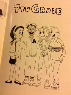 An illustration from my middle school yearbook. Age 12 or so. For a while, a key part of my drawing style was to give characters a circle for a nose!